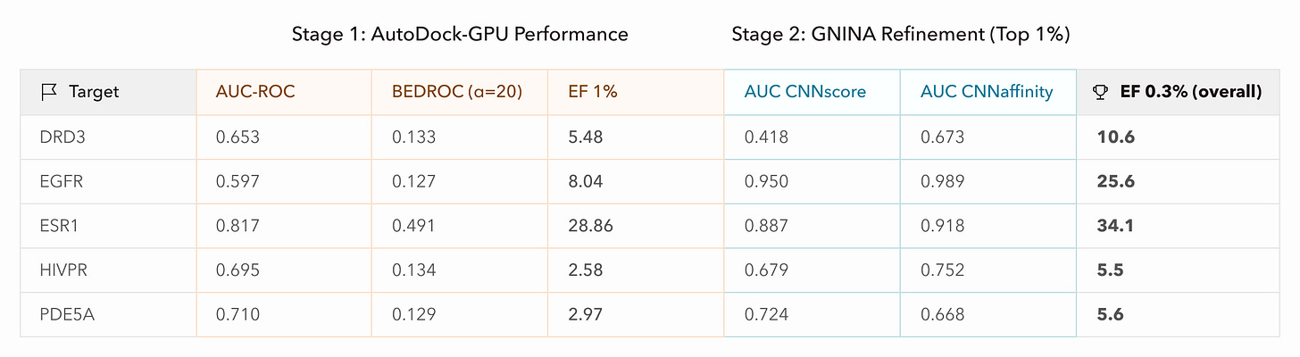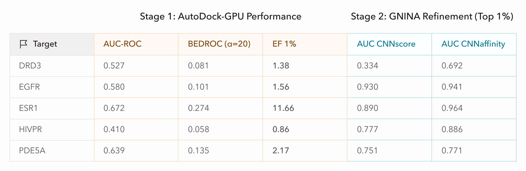 Importantly, Axon is an interactive program—the scientist is always in the loop. If we had been very familiar with DUD-E and knew exactly what needed to be done, we likely could have provided a detailed one-shot prompt instructing Axon to execute the whole process in a single go. Instead, however, we proceeded by collaboratively making a plan with Axon, deciding to run a two-step virtual screening workflow on a subset of DUD-E covering ~155K docking calculations across 5 diverse, pharma-relevant targets; just enough to demonstrate correct and scalable execution of the benchmark. The workflow involved two established docking platforms: a first-pass ranking of the DUD-E ligands with AutoDock-GPU, then further enrichment of the top 1% of the ranked ligands with GNINA, a more expensive, ML-enhanced method.