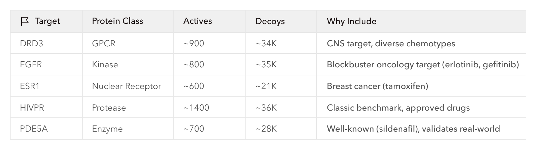 There are many different approaches to molecular docking, and benchmarks have been developed to compare them. One of the most commonly used benchmarks is the DUD-E (Directory of Useful Decoys, Enhanced) dataset comprising 102 diverse protein targets. Each protein is paired with hundreds of active ligands (224 on average), and to emulate the challenge of drug discovery, DUD-E provides 50 property-matched but inactive “decoy” ligands for every active ligand. Docking programs are tasked to rank the blindly mixed actives and decoys by their binding activity, and are evaluated on enrichment factor (EF), a measure of how concentrated the actives are at the top of their ranked lists, and AUC-ROC, which measures true positives against false positives through all possible score cutoffs.