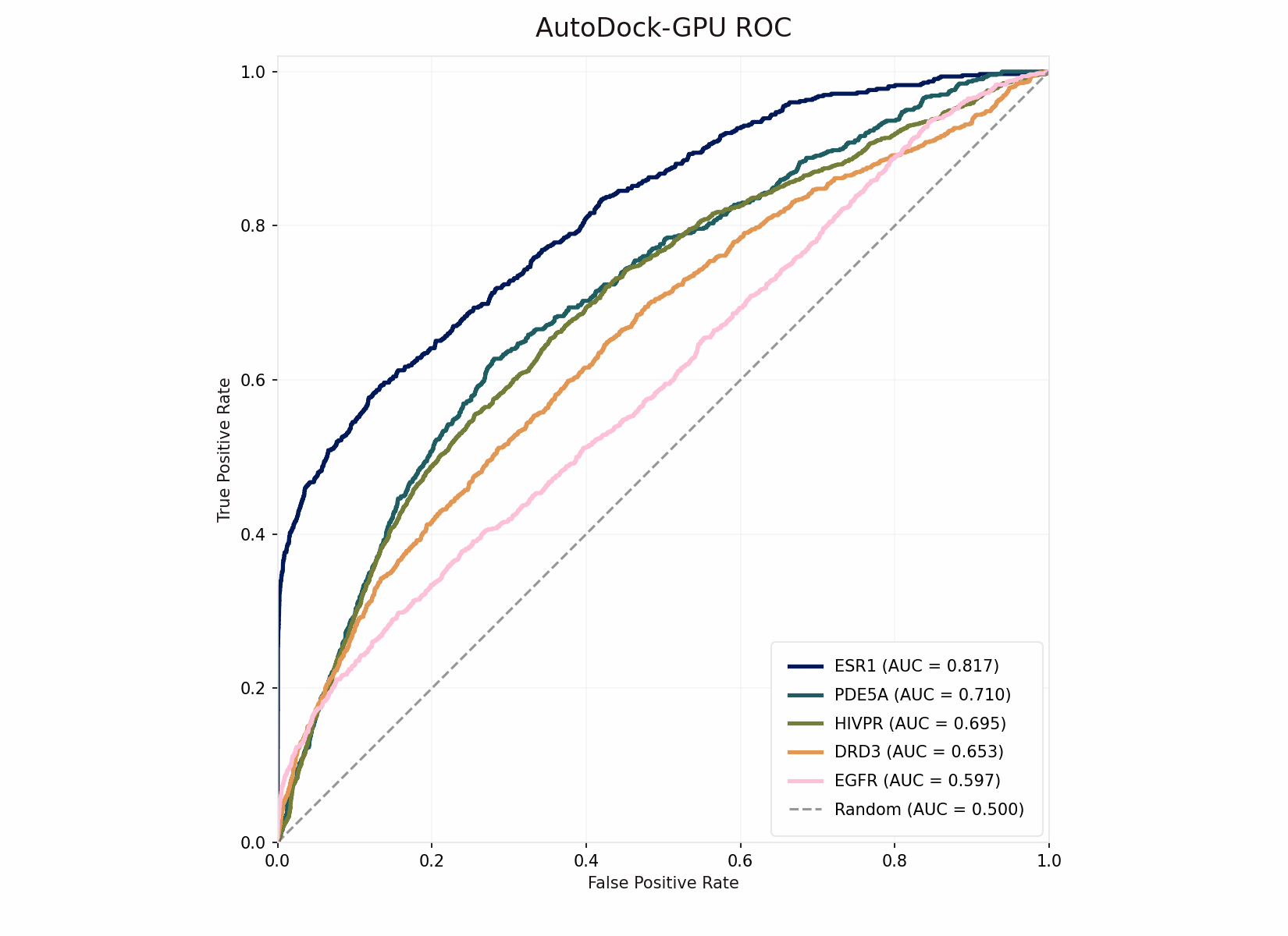 Starting again with a clean session, we pointed Axon to specific files from DUD-E, including SDF-formatted ligand files, and requested that it use MGLTools for receptor and ligand pre-processing, which includes file conversion (AutoDock-GPU uses PDBQT format) and Gasteiger partial charge calculations. We also requested that Axon parallelize docking for each receptor over 32 GPUs, bringing wall-clock time down to half an hour for the run. We let Axon use default parameters for everything else. Immediately, AUC-ROC scores were significantly improved and were on-par with published literature values for these targets, demonstrating correct deployment of AutoDock-GPU.