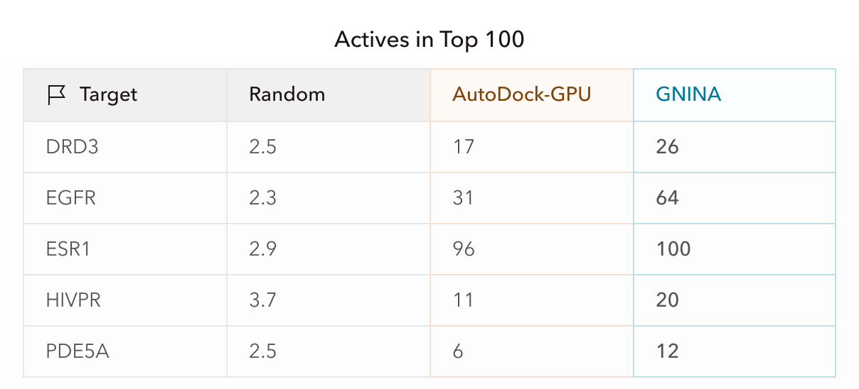 What these results mean practically is that if a small biotech company screened drug candidates and proceeded to test the top 100 molecules experimentally, equivalent to about the top 0.3% of the initial ligand libraries, this screening pipeline would have increased active hits by 5-35x per target. For ESR1, in fact, the top 100 candidates were all active, and GNINA refinement approximately doubled the hit rate for the other targets. This enrichment directly impacts a company’s bottom line and can be notably accelerated with Axon.